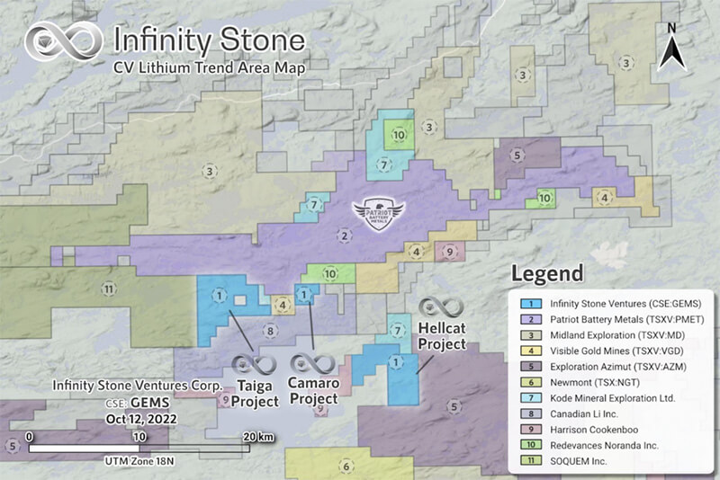 - Infinity Stone Ventures (TSXV:GEMS, OTC:GEMSFTSXV:GEMS, OTC:GEMSF) owns three lithium projects it is currently exploring. While initial drilling is just starting up, these projects are surrounded by successful lithium ventures. One of Infinity Stone’s sites — the Camaro, Taiga, and Hellcat Project — sits right beside a massive find by Patriot Battery Metals (TSXV:PMET). Drilling of nearby sites shows hard-rock lithium at concentrations up to 4.6%. When Patriot Battery Metals first announced their find, the company’s shares leapt nearly 20x.