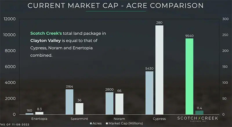 - The “bargain of the century” Scotch Creek has one of the largest land packages in North America’s only lithium-producing jurisdiction. It has 100% ownership of 15,980 acres. And at today’s share price, with a market cap less than $9M, that works out to $556 per acre – a bargain relative to its peers. Other companies in the area are priced at over $26,000 per acre – 48x higher than Scotch Creek.