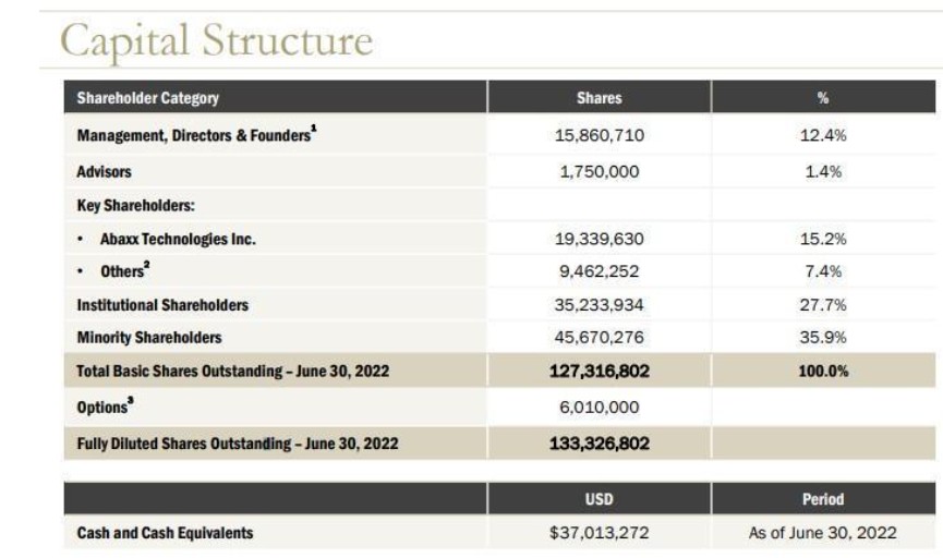 - Well-Balanced Capital Structure: Management, Directors & Founders (12.4%); Advisors (1.4%); Key Shareholders such as Abaxx Technologies Inc. (15.2%) and others (7.4%); Institutional Shareholders (27.7%); and Minority Shareholders (35.9%).