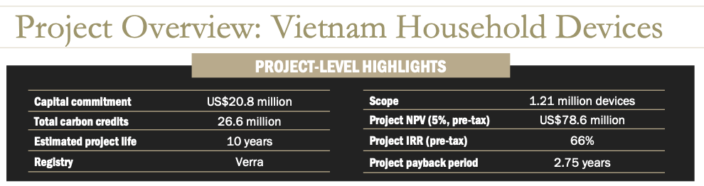 Because 51.4% of Vietnam’s primary household energy is generated from solid fuel combusted within open fires or inefficient cook stoves for cooking or water sanitization, it’s anticipated the project will benefit over 1 million rural Vietnamese households.