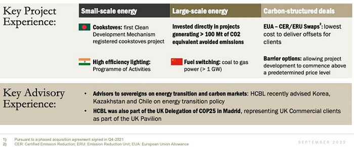 Historically, HCBL has worked with major international corporations, sovereign entities and major financial institutions to identify and diligence large scale carbon reduction projects, drawing from a wide portfolio of investable opportunities around the world.